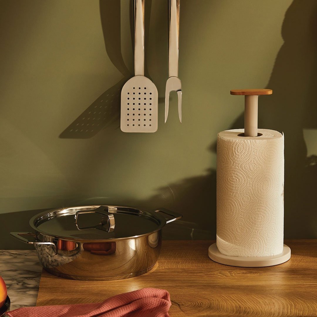 Kompaktni podstavek za kuhinjske brisače (rolo) Alessi Mattina, se ponaša z minimalističnim dizajnom, ki vključuje vrsto detajlov, namenjenih izboljšanju njegove funkcionalnosti. Za blagovno znamko Alessi ga je zasnoval oblikovalski trio Big Game. Podstavek je nepogrešljiv dodatek v kuhinji, pogosto pa se je začel pojavljati tudi na naših mizah, saj ponuja odlično alternativo papirnatim servietam, ki so pogosto manj vpojne od papirnatih brisač. Podstavek je izdelan iz jela v svetlo sivi barvi, ki ga na vrhu krasi lesen detajl iz bambusovega lesa. Ni primerno za pomivanje v pomivalnem stroju. NAMIG: Dopolnite ga še z ostalimi izdelki iz iste linije Mattina.