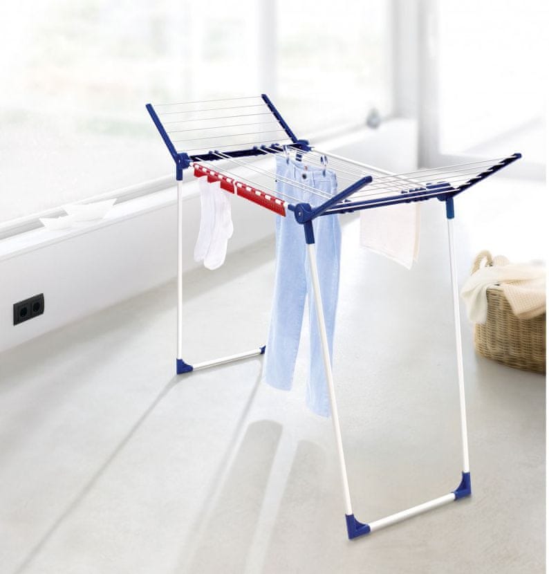 Sušilnik perila 200 Varioline je zelo trdno, stabilno in zložljivo stojalo za sušenje perila. Skupna površina za sušenje je 20 metrov. Je v kombinaciji modre in bele barve. Primeren za uporabo na prostem.