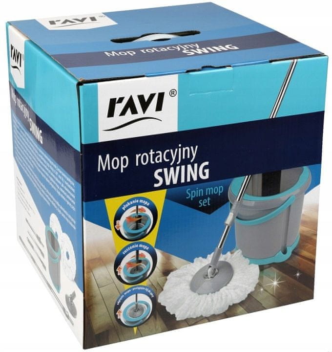 Komplet krpe Mop Swing s spin krpo z vedrom ponuja napredno tehnologijo in enostavno uporabo. Ta sodoben in praktičen komplet olajša čiščenje. Vključuje vedro z mehanizmom za centrifugiranje vode in nedrsečimi nogicami. Poseben sistem centrifugiranja omogoča enostavno uravnavanje ravni vlažnosti krpe in hitro odstranjevanje odvečne vode. Oblikovana košara z dvojno funkcijo: postavitev košare na spodnjo raven omogoča namakanje in izpiranje krpe, dvig košare na višjo raven (nad gladino vode) pa krpo posuši do želene ravni vlažnosti. Pokrov na vrhu vedra preprečuje brizganje vode med ožemanjem. Vrteči se sistem zagotavlja natančno ožemanje krpe zahvaljujoč sprostitveni sponki: zategovanje sponke varno zaklene ročaj; zrahljanje sponke omogoča vrtenje krpe med ožemanjem. Tridelni teleskopski zložljivi ročaj omogoča zlaganje krpe. Čistilni element krpe je izdelan iz izjemno vpojne in nežne mikrovlakne, ki vpije vso umazanijo in jo zadrži, dokler se ne spere. Odlično čisti in polira tudi brez uporabe detergentov. Parametri: Barva: modra, siva Prostornina vedra: 9 l Material: plastika Komplet vsebuje: nastavljiv ročaj, dva zamenljiva nastavka, vedro za ožemanje, ožemalnik Dolžina ročaja: 120 cm Dimenzije vedra: višina 25 cm x širina 26 cm