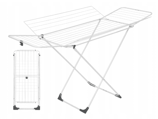 Sušilnik perila na vrvi za balkon: Ta sušilnik perila na vrvi je zasnovan za sušenje spodnjega perila in drugih oblačil. Je idealna rešitev za sušenje perila tako v zaprtih prostorih kot na prostem, na balkonu ali vrtu. Jeklena konstrukcija je opremljena z nedrsečimi podlogami, ki preprečujejo praskanje tal. Sušilnik je odporen na vremenske vplive in primeren za shranjevanje na prostem, tudi pri nizkih temperaturah, pa tudi v zaprtih prostorih. Parametri: Dimenzije v razgrnjenem stanju: 183 × 96 × 99 cm Dimenzije v zloženem stanju: 125 × 55 × 5 cm Dolžina vrvi: 24 m Število kril: 4 Največja obremenitev: 22 kg Material: plastika, jeklo