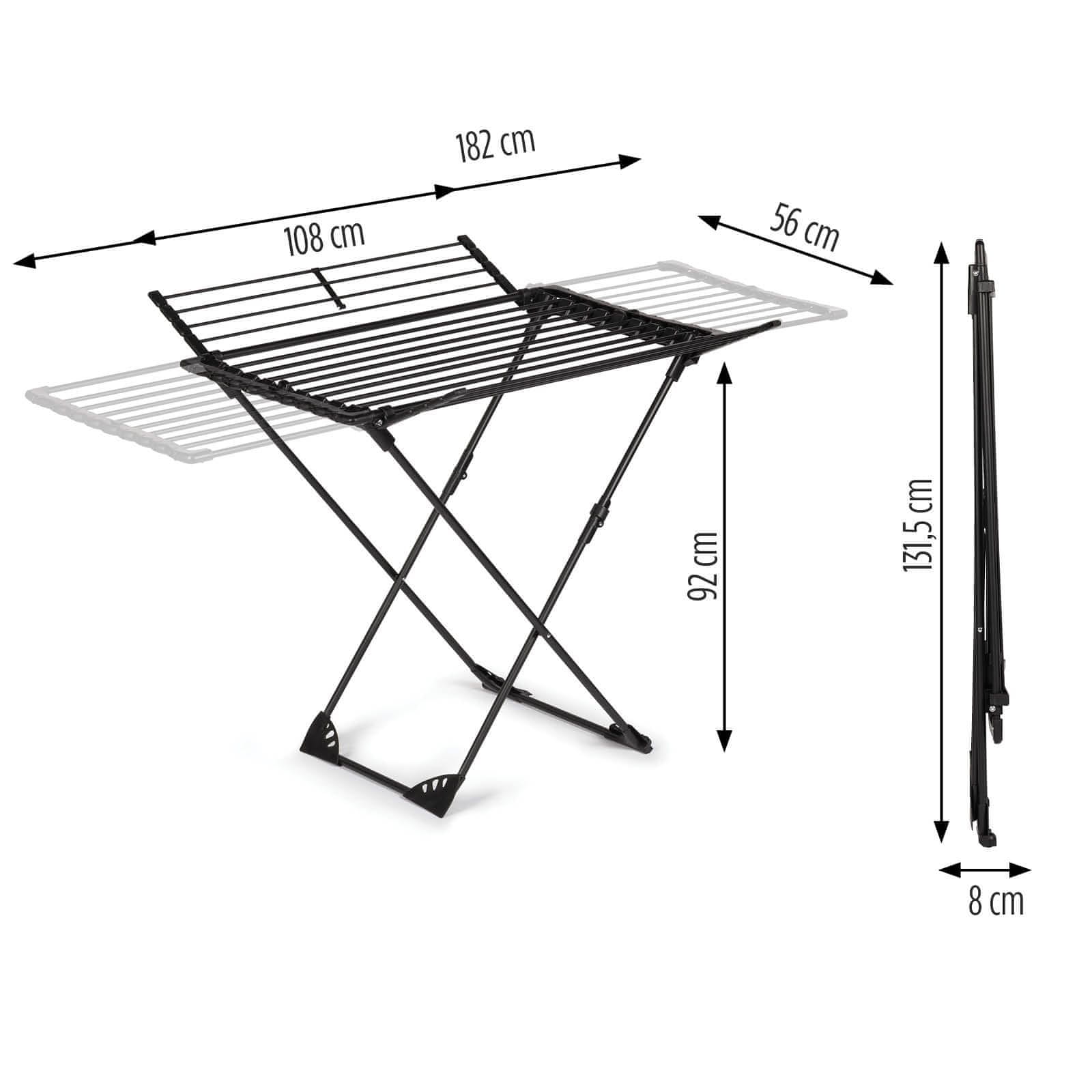 DryMax Wing s svojo trpežno konstrukcijo iz železa in 38 sušilnimi prečkami zagotavlja visoko zmogljivost in stabilnost. Njegova maksimalna obremenitev je 20 kg, kar pomeni, da lahko brezskrbno posušite velike količine oblačil. S 4-smernim raztezanjem lahko stojalo prilagodite vsaki količini in vrsti perila.