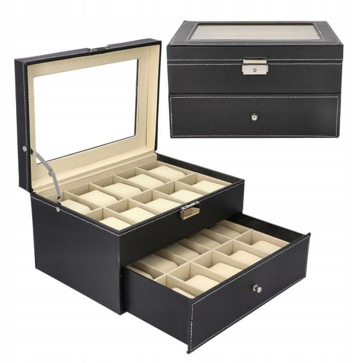 Dvoetažna zasnova omogoča shranjevanje kar 20 ročnih ur v enem kompaktnem etuiju. Spodnji predal je idealen za dodatke, kot so zapestnice ali verižice, kar omogoča organiziranost in prihranek prostora na polici ali toaletni mizici.