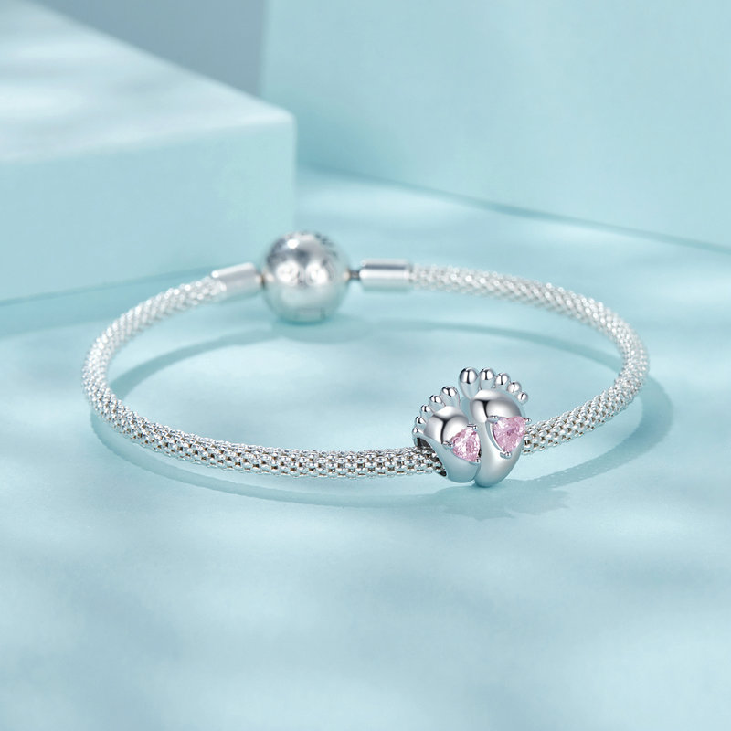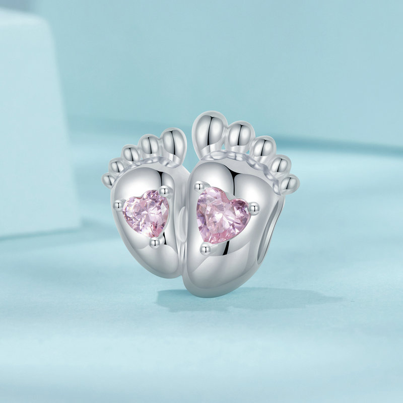 Edinstven obesek, izdelan iz srebra Čistost 925 . Obesek prikazuje dve majhni in dve veliki nogi, okrašeni z rožnatimi srčki iz najkakovostnejšega kubičnih cirkonija.