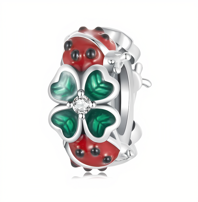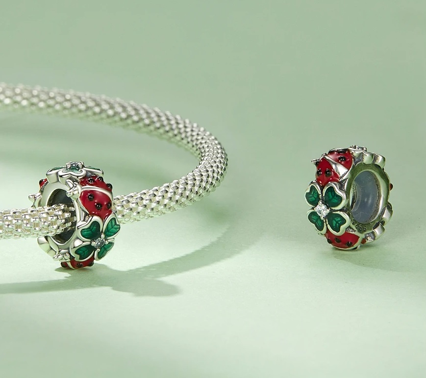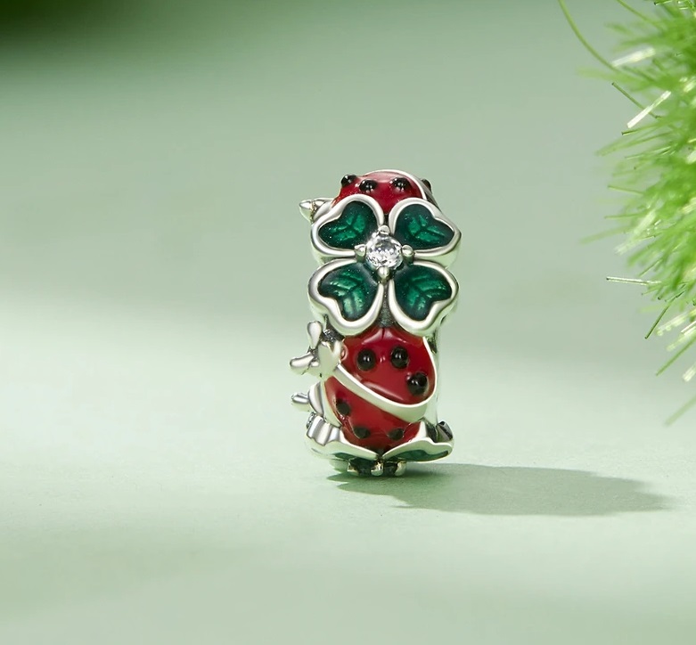 Edinstven obesek, izdelan iz iz srebra 925. Štoparica je okrašena z drobnimi štiriperesnimi deteljicami in pikapolonicami.
