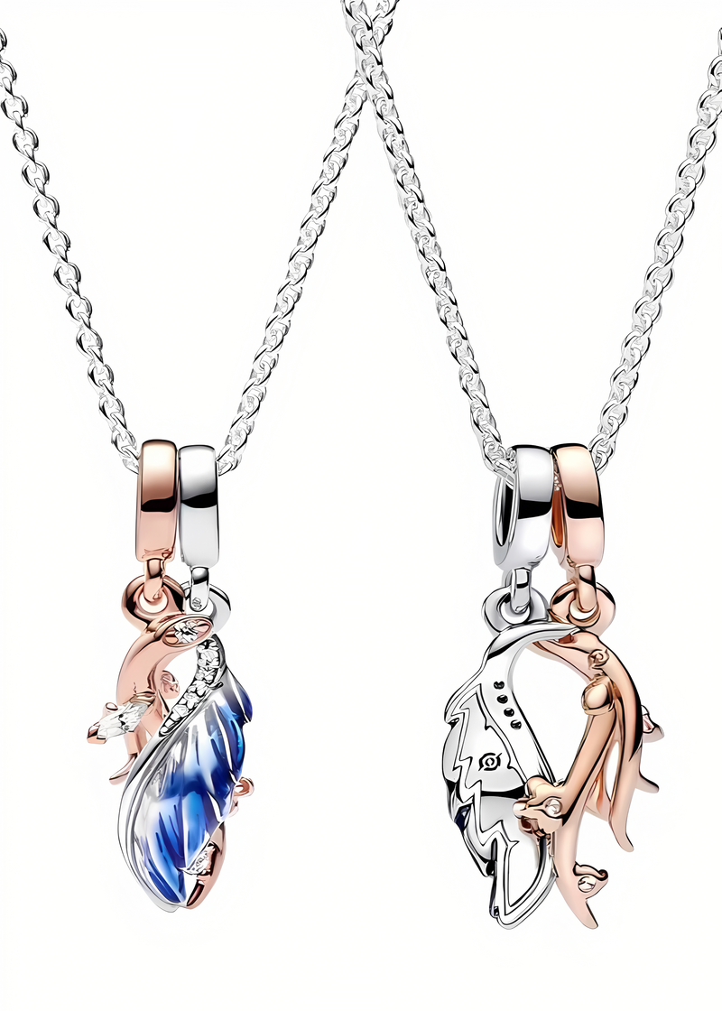 Unikaten posrebren obesek, ki združuje dva obeska – enega iz rožnatega zlata v obliki vejice s cvetovi, okrašenimi z belimi cirkoni, in drugega srebrnega v obliki kril z modrim perjem.