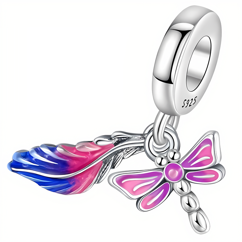 Edinstven posrebren obesek z barvitim peresom in roza kačjim pastirjem.