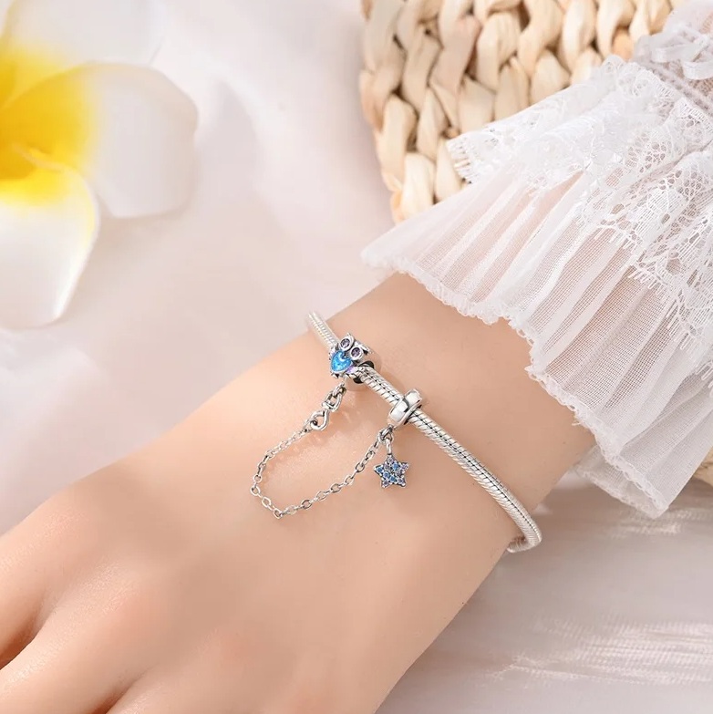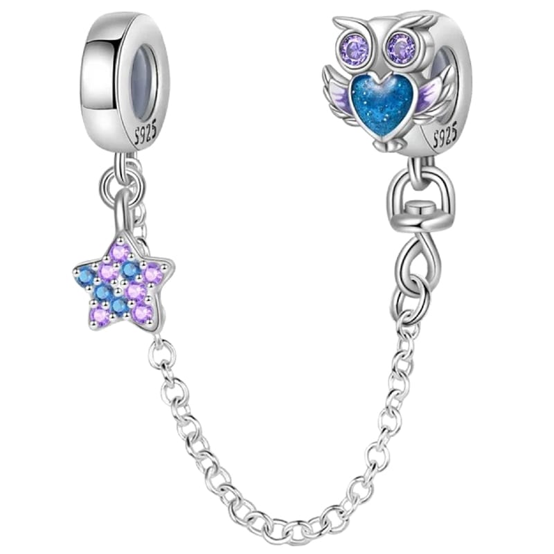 Varnostna verižica za modularne zapestnice, izdelana iz posrebrenega bakra. Verižica je na eni strani okrašena s sovo z vijoličnimi očmi iz kubičnih cirkonov in modrim srcem na trebuhu, na drugi strani pa ima visečo zvezdo, okrašeno z najkakovostnejšimi vijoličnimi in temno modrimi kubičnimi cirkoni.