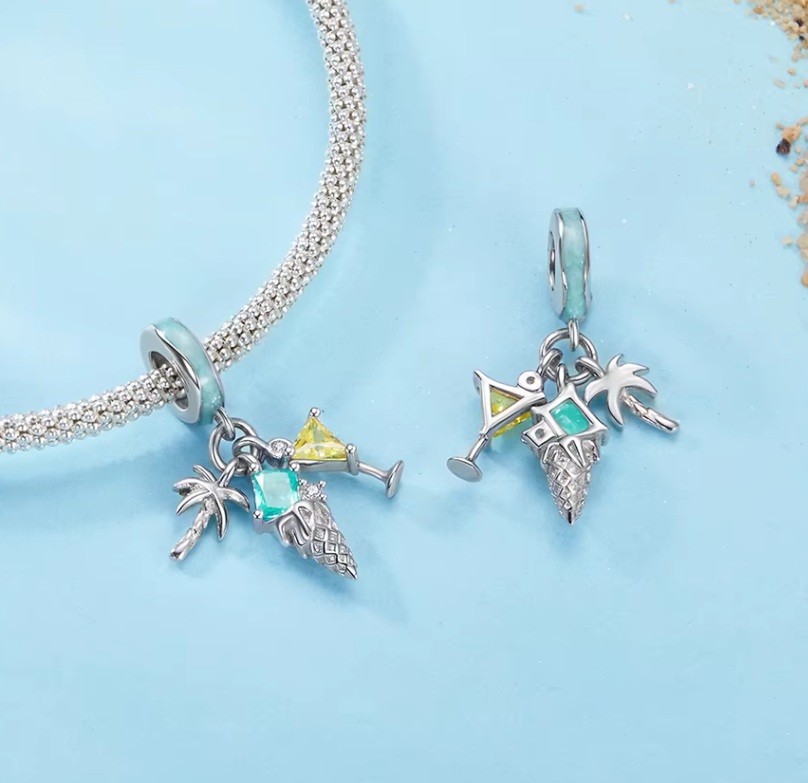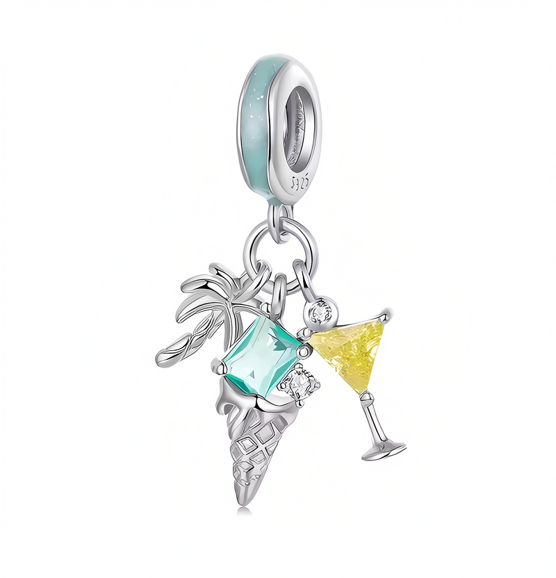 Edinstven obesek, izdelan iz iz Srebro 925 . Trojni obesek s palmo, pijačo, okrašeno z velikim rumenim kubičnim cirkonijem, in kornetom za sladoled, izdelanim iz najkakovostnejšega zelenega in belega kubičnih cirkonija.
