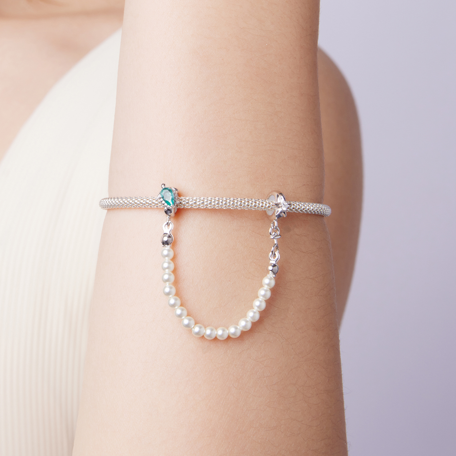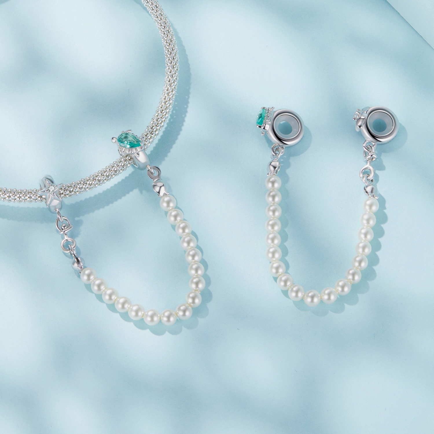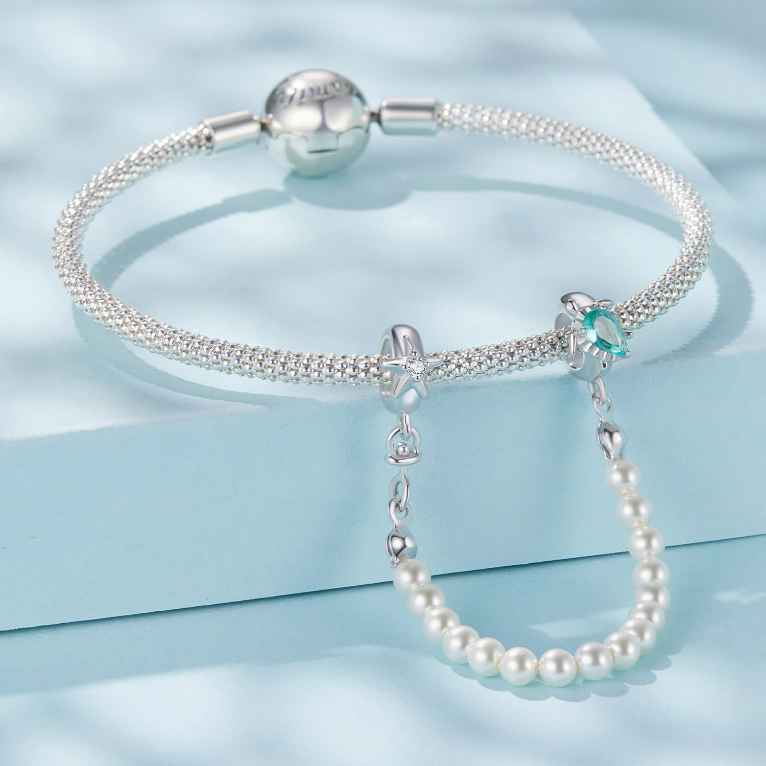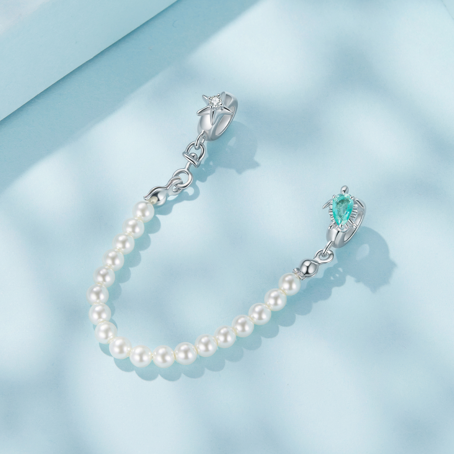 Varnostna verižica za modularne zapestnice, iz visokokakovostnega srebra 925, okrašena s sintetičnimi biseri in na eni strani morsko želvo z oklepom iz zelenega kubčnega cirkonija, na drugi strani pa morsko zvezdo z belim kubičnim cirkonijem v sredini.