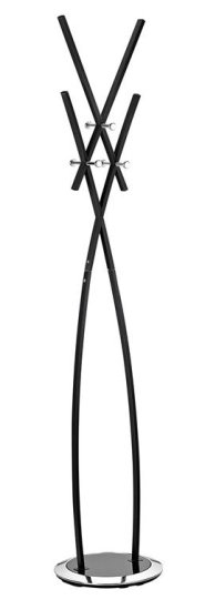Kovinsko stojalo, črno lakirano. 6 kovinskih obešalnikov za plašče + dodatne možnost obešanja. Okrogel podstavek s črnim ojačanim steklom. Višina cca. 182cm, premer cca. 37 cm. Celoten opis