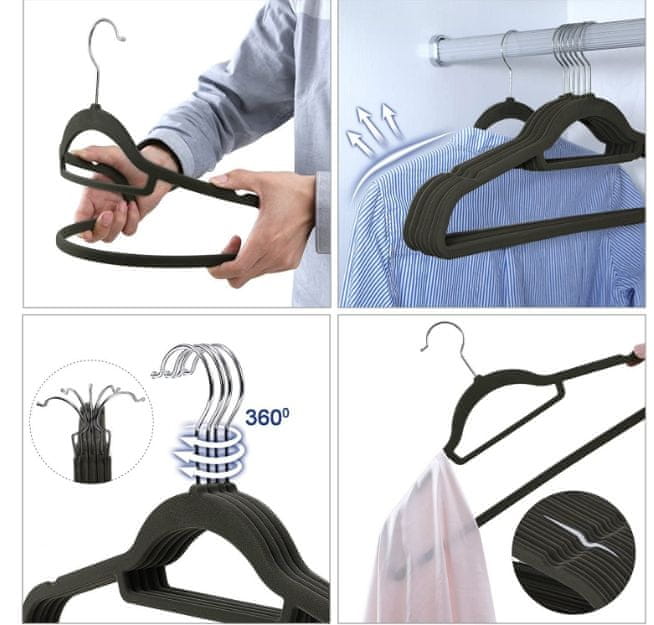 Praktičen obešalnik za oblačila s prevleko iz črnega velurja je idealen za enostavno organiziranje garderobe. Nedrseča površina ohranja oblačila na mestu in preprečuje drsenje. Obešalniki so narejeni iz lahke in močne ABS plastike, ki zdrži do 5 kg. Celoten opis
