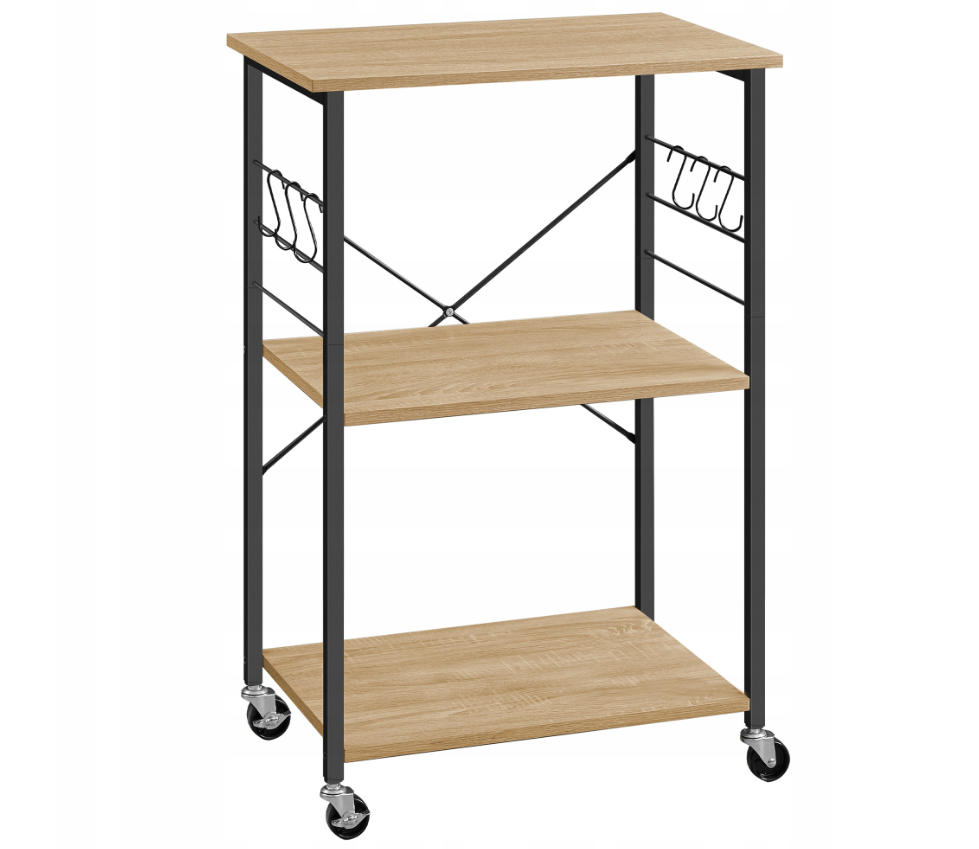Večfunkcijski kuhinjski regal na kolesih TRONUS, črna/hrast sonoma, je idealna rešitev za praktično ureditev vaše kuhinje. Zaradi treh prostornim polic lahko preprosto shranite mikrovalovno pečico, kavni aparat, krožnike in drugo kuhinjsko opremo. Celoten opis