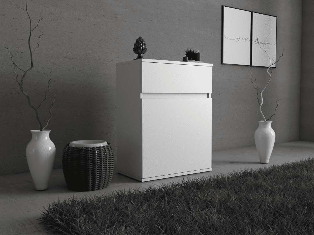 Ta komoda je bila zasnovana z mislijo na praktično shranjevanje. Ena vrata in predal ponujata dovolj prostora za vsakodnevne potrebščine, kar vam omogoča enostavno organizacijo stvari. Notranje police so idealne za večje predmete, predal pa je odličen za manjše dodatke. Zahvaljujoč robustnim ročajem je uporaba komode udobna in intuitivna. Ta kos pohištva ni le praktičen, temveč je tudi eleganten dekorativni element, ki bo vsaki notranjosti dodal eleganco.