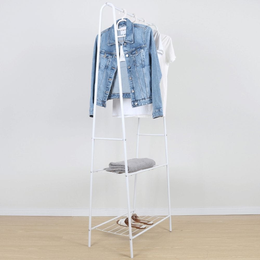 Spoznajte praktičnega pomočnika, ki bo z veseljem poskrbel za vaša oblačila. Kovinsko stojalo za oblačila RETOR je sestavljeno iz dveh polic, na katere lahko odložite torbico, šal ali čevlje, v zgornjem delu pa palica za obešalnik. Njegova trdna konstrukcija je izdelana iz kovine v fini beli barvi. Skupne dimenzije stojala so (ŠxGxV): 60×35×160 cm in se dostavi v razstavljenem stanju. Naj ne čaka dolgo in ga uporabite v spalnici, otroški ali študentski sobi, predsobi ali kjer koli vam ustreza.