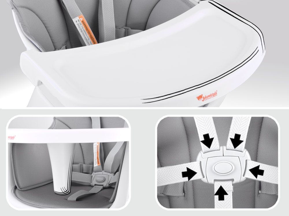 Otroški stol je komplet 6 v 1, idealen za otroke od 6. meseca starosti, ki so začeli sedeti brez pomoči. Modularni kos pohištva v modernem slogu se bo podal v vsako otroško sobo, dnevno sobo, kuhinjo. Zahvaljujoč možnosti uporabe v različnih možnostih se bo prilegal k jedilni mizi, pa tudi k otroškemu igralnemu kotičku. Udoben sedež, pravilno profiliran, ima pet točkovne varnostne pasove, blokado proti zdrsu s stola. Oblazinjenje, s katerim je prevlečen sedež, je zračno, izdelano iz materiala, ki se lahko čisti, kar je pomembno pri ohranjanju čistoče pohištva. Pohištvo ima odstranljiv pladenj, ki se enostavno čisti. Noge stola imajo nedrseče podloge. Večnamenski kos pohištva bo rasel z otrokom in se zlahka prilagajal zahtevanim potrebam v dani situaciji.