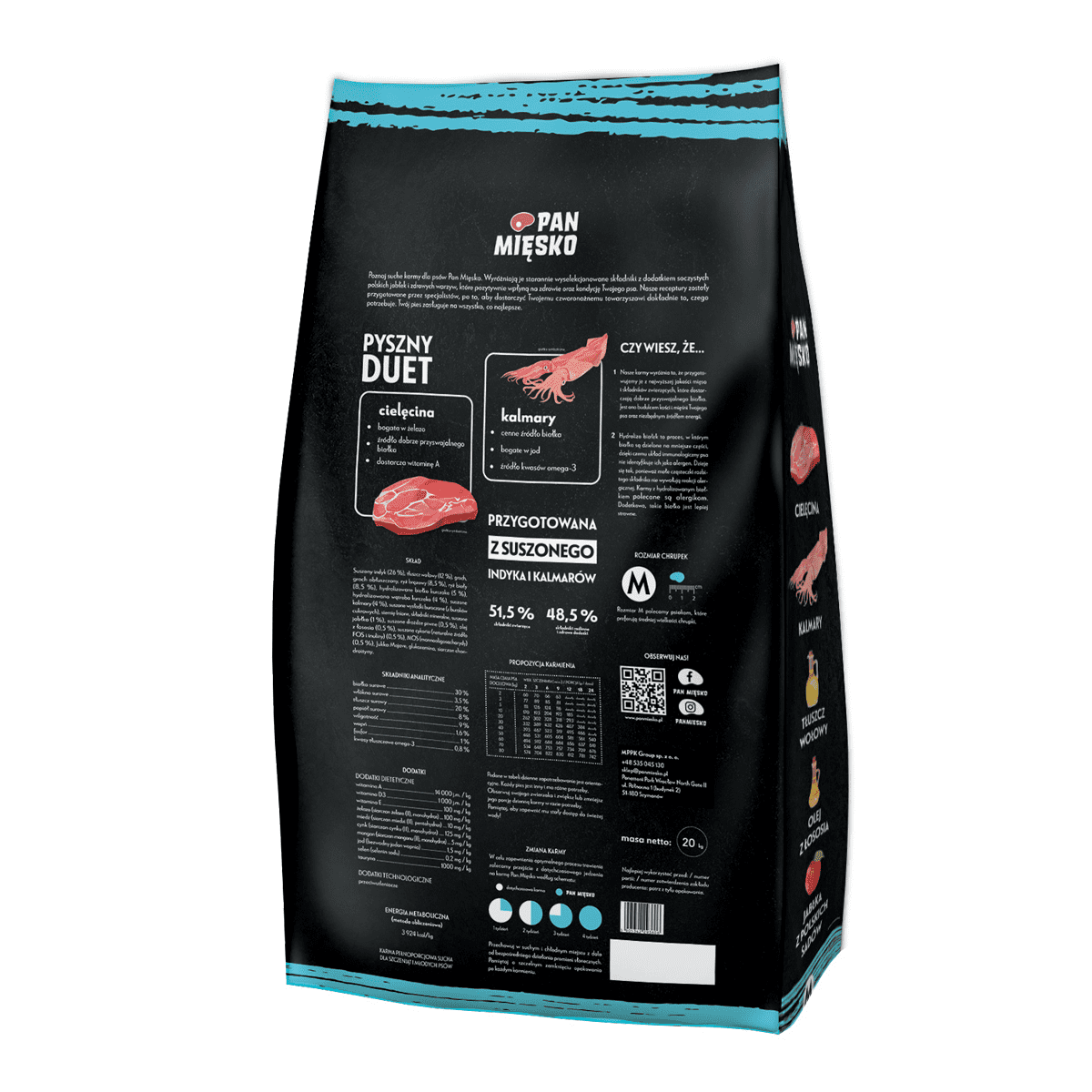 PAN Mięsko Puran z lignji 20 kg (M) HIPOALERGENA POPOLNA HRANA ZA MLADIČKE IN MLADE PSE. 51,5 % mesa in živalskih sestavin. Narejeno iz posušenega purana in lignjev. Izdelano na Poljskem! Odkrijte hipoalergeno suho hrano za pse Pan Mięsko. Vsebuje skrbno izbrano meso z dodatkom sočnih poljskih jabolk, zdrave zelenjave in dragocenih hranil, ki bodo pozitivno vplivala na zdravje in dobro počutje vašega psa. Naše recepte so razvili strokovnjaki, da bi vašemu štirinožnemu spremljevalcu zagotovili točno tisto, kar potrebuje. Vaš pes si zasluži najboljše. OKUSEN DUO: PURAN Z LIGNJI Puran: – pusto meso – bogato z lahko prebavljivimi beljakovinami – vir cinka in selena Lignji: – dragocen vir beljakovin – bogato z jodom – vir omega 3 kislin 51,5 % živalskih sestavin 48,5 % rastlinskih sestavin in zdravih dodatkov SESTAVINE: Posušen puran (26 %), goveja maščoba (12 %), grah, oluščen grah, rjavi riž (8,5 %), beli riž (8,5 %), hidrolizirane piščančje beljakovine (5 %), hidrolizirana piščančja jetra (4 %), posušeni lignji (4 %), posušena pesina pulpa (iz sladkorne pese), laneno seme, minerali, posušena jabolka (1 %), posušen pivski kvas (0,5 %), lososovo olje (0,5 %), posušena cikorija (naravni vir FOS in inulina) (0,5 %), MOS (mano-oligosaharidi) (0,5 %), juka Mojave, glukozamin, hondroitin sulfat. ANALITIČNE SESTAVINE: Surove beljakovine 30 %, Surove vlaknine 3,5 %, Surove maščobe 20 %, Surovi pepel 8 %, Vlaga 9 %, Kalcij 1,6 %, Fosfor 1 %, Omega-3 maščobne kisline 0,8 %. DODATKI: HRANILNI DODATKI: Vitamin A 14.000 IU/kg, Vitamin D3 1.000 IU/kg, Vitamin E 100 mg/kg, Železo (Železov (II) sulfat, monohidrat) 100 mg/kg, Baker (bakrov (II) sulfat, pentahidrat) 10 mg/kg, Cink (cinkov (II) sulfat, monohidrat) 125 mg/kg, Mangan (manganov (II) sulfat, monohidrat) 5 mg/kg, Jod (brezvodni kalcijev jodat) 1,5 mg/kg, Selen (natrijev selenit) 0,2 mg/kg, tavrin 1000 mg/kg. METABOLIČNA ENERGIJA (kcal/100 g): 3.924 kcal/kg RAZPOLOŽLJIVO PAKIRANJE: 3 kg, 9 kg, 20 kg RAZPOLOŽLJIVE VELIKOSTI CRUNCH: M STE VEDELI, DA… 1. Naša hrana se od drugih razlikuje po tem, da je pripravljena iz najkakovostnejšega mesa in živalskih sestavin, ki zagotavljajo lahko prebavljive beljakovine. Te so gradnik kosti in mišic vašega psa ter bistven vir energije. 2. Hidroliza beljakovin je postopek, pri katerem se beljakovine razgradijo na manjše dele, tako da jih pasji imunski sistem ne prepozna kot alergene. To se zgodi, ker majhni delci razgrajene sestavine ne povzročajo alergijske reakcije. Hrana s hidroliziranimi beljakovinami je priporočljiva za alergike. Poleg tega so takšne beljakovine lažje prebavljive. Forma na 6 je naš prepoznavni recept za zdravje in telesno pripravljenost vašega psa! Odkrijte prednosti posebej izbranih sestavin, ki vašemu psu zagotavljajo vse, kar potrebuje! ZDRAV DUH – zahvaljujoč omega-3 maščobnim kislinam DOBRA PREBAVA – zagotavljajo jo prebiotiki, kot sta posušena cikorija in MOS ZDRAVI SKLEPI – podprti z zdravimi dodatki, kot sta glukozamin in hondroitin, ter omega-3 maščobnimi kislinami MOČNA IMUNITETA – zgrajena s tavrinom in posušenim pivskim kvasom LEPA, SIJOČA DLAKA – zagotavlja dodatek lososovega olja MANJ TARTUMA – rezultat optimalno uravnotežene prehrane NAVODILA ZA HRANJENJE: Dejanske potrebe po hrani se lahko razlikujejo glede na stopnjo aktivnosti in splošno stanje vašega ljubljenčka. Spremljajte svojega ljubljenčka in po potrebi zmanjšajte ali povečajte dnevno količino. Ne pozabite mu zagotoviti stalnega dostopa do sveže vode!