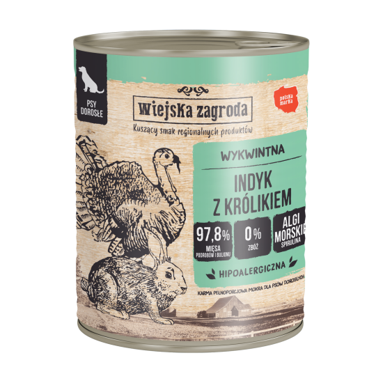 Wiejska Zagroda Mokra hrana za pse Puran z zajcem (odrasel) 800 g POPOLNA HRANA ZA ODRASLE PSE SESTAVA: 45 % puran (16 % meso, 13 % požiralnik, 10 % želodec, 6 % jetra), 25 % zajec (meso, drobovina), 27,8 % jušna osnova, minerali, 0,1 % lososovo olje, 0,1 % spirulina. ANALITSKE SESTAVINE: surove beljakovine 10 %, surove maščobe 6,2 %, surovi pepel 2,3 %, surove vlaknine 0,1 %, vlaga 80,5 %, kalcij 0,39 %, fosfor 0,31 %. PREHRANSKI DODATKI: vitamin D3: 200 IU/kg, vitamin E: 25 mg/kg, cink (cinkov sulfat monohidrat): 15 mg/kg, mangan (manganov sulfat monohidrat): 3 mg/kg, jod (brezvodni kalcijev jodat): 0,5 mg/kg. METABOLIČNA ENERGIJA kcal / 1 kg: 982. RAZPOLOŽLJIVA EMBALAŽA: 400 g in 800 g SHRANJEVANJE: Hrano hranite na hladnem in suhem mestu. Po odprtju hranite v hladilniku v 24 urah. Uporabno najmanj do: datum in številka serije na dnu embalaže. Številka odobritve proizvajalca: glejte zadnjo stran embalaže. Wiejska Zagroda je poljska blagovna znamka, ki je nastala iz potrebe, da našim mačkam zagotovimo tisto, kar potrebujejo: meso ali ribe in dragocene drobovine! Mokra hrana Wiejska Zagroda je popoln, zdrav obrok za pse, ne glede na to, ali so majhni ali veliki, kratkodlaki ali kosmati. Osnova tega obroka je duo skrbno izbranega mesa in drobovine. To so najpomembnejše in najpomembnejše sestavine, prelite v okusno juho. Kombinacija nežnega in sočnega zajčjega mesa ter lahko prebavljivega purana je odlična izbira za vsakega psa, tudi za tiste z občutljivim želodcem. Lososovo olje je dragocen dodatek, bogat z omega-3 maščobnimi kislinami EPA in DHA, ki med drugim podpirata delovanje srca in možganov. Pozitivno vpliva tudi na zdravje kože in dlake vašega ljubljenčka. Druga edinstvena sestavina so koristne morske alge, bogastvo vitaminov, mineralov in dragocenih hranil. Ta dragocena sestavina krepi imunski sistem in blagodejno vpliva na prebavni sistem vašega ljubljenčka. NAŠE PREDNOSTI: meso in dragoceni drobovinski proizvodi so glavne sestavine naše hrane, brez žitaric, brez glutena, brez GSO, sijoča dlaka zaradi vsebnosti lososovega olja, dodatek morskih alg (spirulina), bogatih z vitamini in minerali, nizka vsebnost ogljikovih hidratov je znak, da je hrana pravilno uravnotežena, preproste sestavine, natančno opisane, pregledna sestava, poljska blagovna znamka