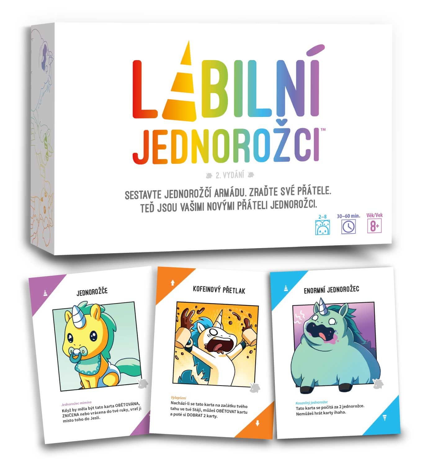 Label Unicorns je strateška igra s kartami o dveh naših najljubših stvareh: enorožcih in uničevanju! Na začetku imate v svoji konjušnici majhnega samoroga. Veliko „whoo!“ Le ne zaljubite se preveč vanj, saj v tej igri tudi majhni enorožci niso varni!" Zberete lahko več kot 20 vrst čarobnih enorožcev z lastno dodatno močjo za svojo vojsko! Svojo vojsko zgradite čim hitreje, sicer vas bodo nekateri vaši bodoči prijatelji uničili. Ne glede na to, ali se nameravate maščevati ali braniti svojo konjušnico, uporabite magijo! Vendar nikamor ne hitite, saj ima lahko kdo karto „Íhaha“! Kdor prvi konča svojo enorogovo vojsko, bo večno hvaljen… vsaj do naslednje igre. Veliko sreče!Vsebina paketa:135 kart1 češka pravila