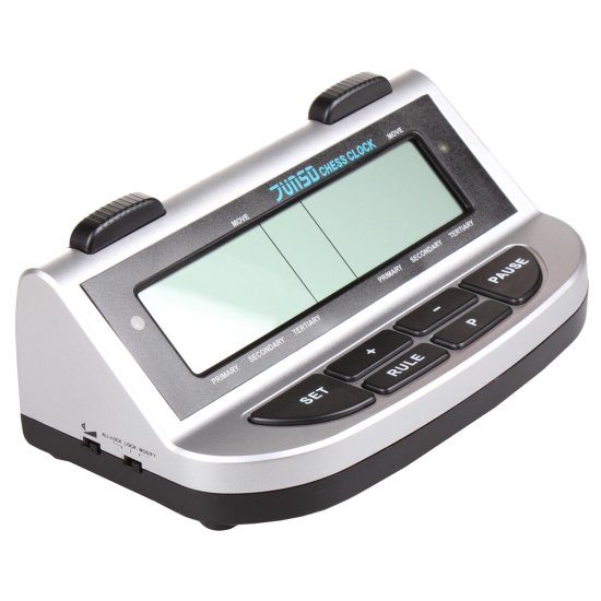Profesionalna šahovska ura z velikim LCD-zaslonom, primerna za šahovske turnirje. Celoten opis
