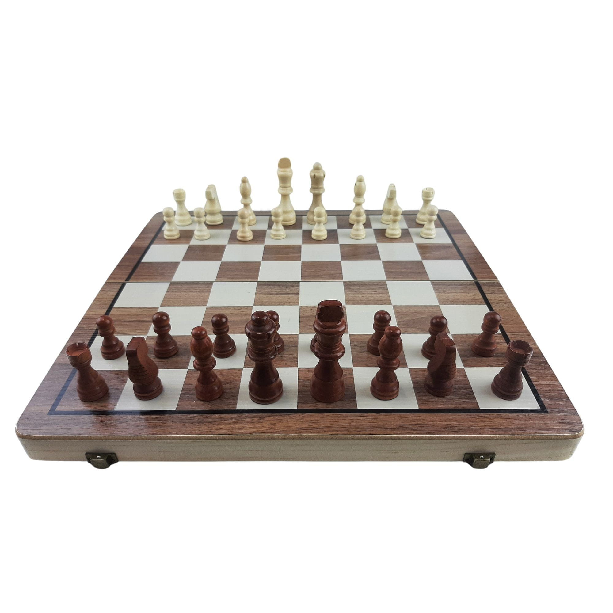 Klasični leseni šahovski komplet v visokokakovostnem lesenem kovčku, ki je hkrati tudi šahovnica velikosti 39 × 39 cm. Poleg običajnega kompleta šahovskih figur sta v paketu tudi dve rezervni figuri kraljice, komplet pa dopolnjuje 24 kamnov za klasično igro šahovnice. Šahovske figure imajo na dnu magnet, zaradi katerega se prijetno držijo na šahovnici in ni nevarnosti, da bi se premaknile, na primer v primeru neželenega premikanja.