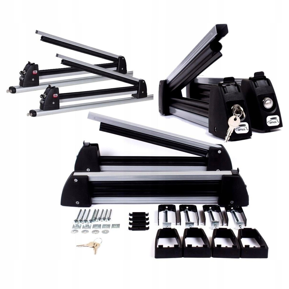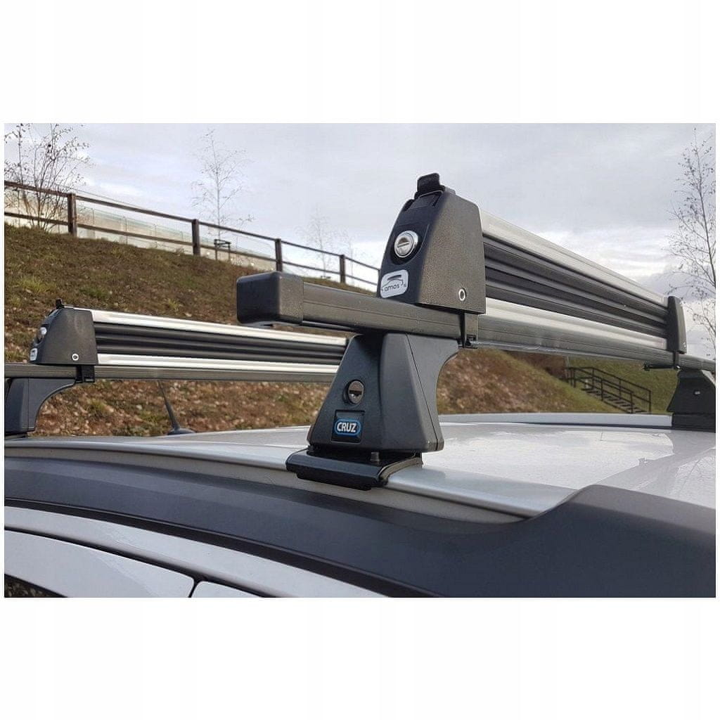 Univerzalna montaža: Naš nosilec za smuči lahko namestite tako na jeklene palice (z uporabo objemk) kot na aluminijaste palice (z uporabo drsnikov). Zaradi tega je primeren za večino strešnih nosilcev.