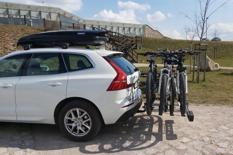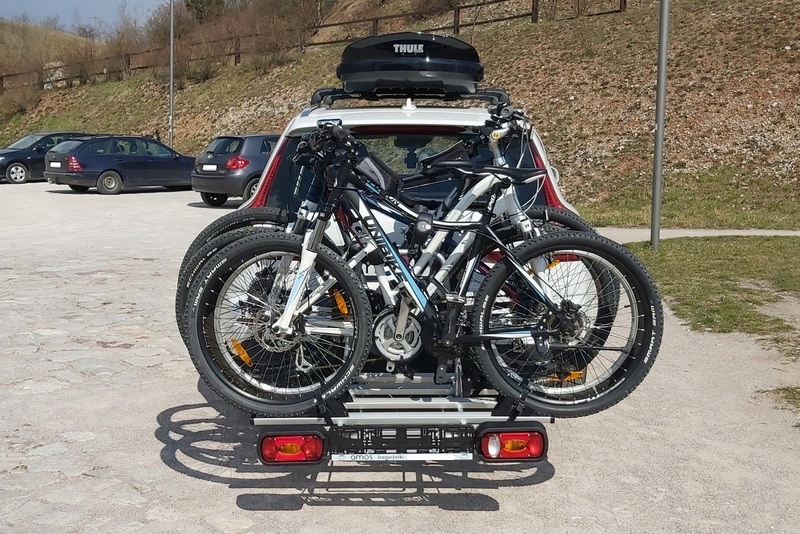 Zahvaljujoč temu platforma ne zavzame veliko prostora in jo je mogoče shraniti v prtljažnik večine avtomobilov. (Ilustrativna fotografija kolesa Amos Giro 3, prikazana spodaj) Široki nosilci koles z močnimi trakovi, katerih razmik je mogoče nastaviti. Omogočajo