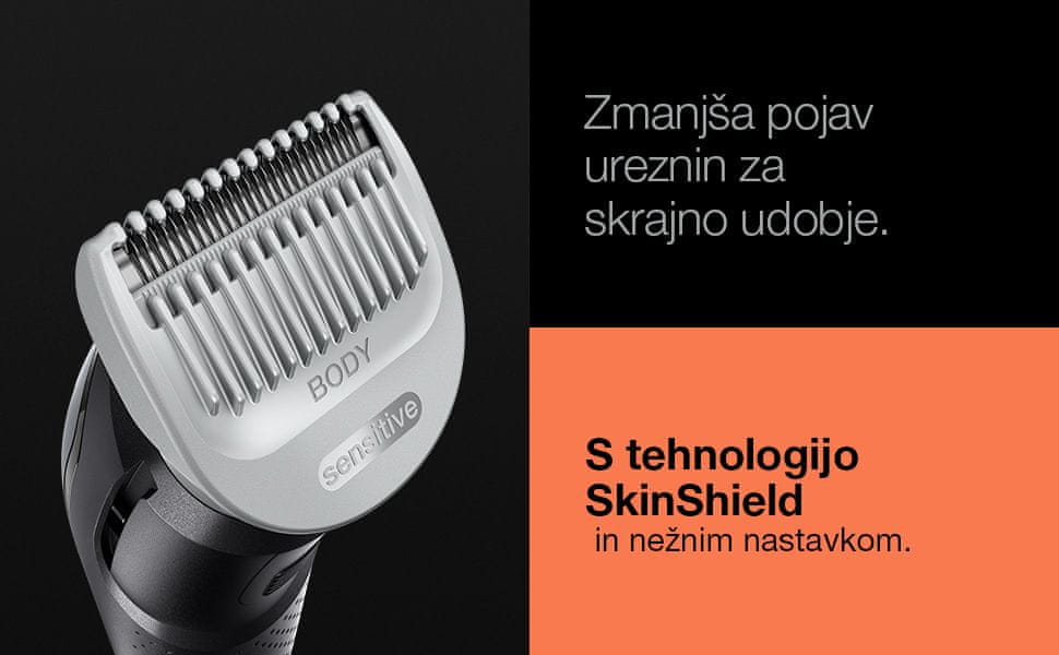 Urejevalnik se ponaša s SkinShield tehnologijo, ki ščiti kožo in občutljive predele pred urezninami. Olajšuje urejanje dlak po celem telesu – varno, nežno in higienično.