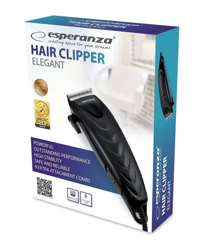 Predstavljamo vam Esperanza HAIR CLIPPER ELEGANT BLACK, vašo rešitev za čisto, udobno in profesionalno nego las! S tem strižnikom lahko pozabite na dolgotrajne obiske frizerja. Užitkajte v negi doma in ustvarite svojo želeno pričesko z minimalnim naporom. Strižnik združuje vrhunske funkcionalnosti, kot so precizno nerjaveče jekleno rezilo, mogočen rotacijski motor ter ergonomično oblikovano ohišje, ki zagotavlja varen in prijeten oprijem. Z ročico za nastavitev dolžine in 4 nastavki za različne dolžine, omogoča popolnoma prilagojeno in personalizirano ureditev. Naj vam dolžina napajalnega kabla 1,5 m omogoča prosto gibanje med oblikovanjem videza, medtem ko zanka za obešanje zagotavlja enostavno shranjevanje. Naprava deluje pri napetosti 230 V/50 Hz in moči 10 W, kar zagotavlja dolgotrajno zmogljivost in učinkovitost brez primere. V paketu prejmete vse, kar potrebujete za optimalno delovanje, vključno s priročnikom in vzdrževalnim oljem, da bo vaš strižnik vedno pripravljen za uporabo.