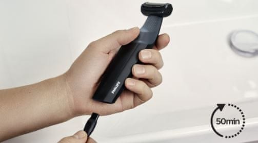 Gumijasti ročaj brivnika Philips BG3010/15 je zasnovan tako, da zagotavlja popoln nadzor pri britju tudi kadar se brijete pod tušem. Njegova vodotesna konstrukcija omogoča enostavno vzdrževanje, po uporabi ga samo sperite. Indikator baterije označuje stanje napajanja – za 50 minut delovanja potrebuje 8 ur polnjenja iz omrežja.