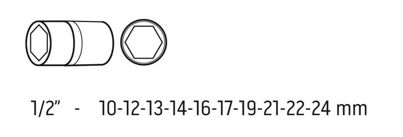 Nastavek v kompletu: 1/2", šesterokotnik: 10, 12, 13, 14, 16, 17, 19, 21, 22, 24 mm