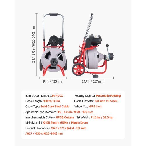 VEVOR Stroj za čiščenje odtokov 30 m x 95 mm 627x435x620-940 mm