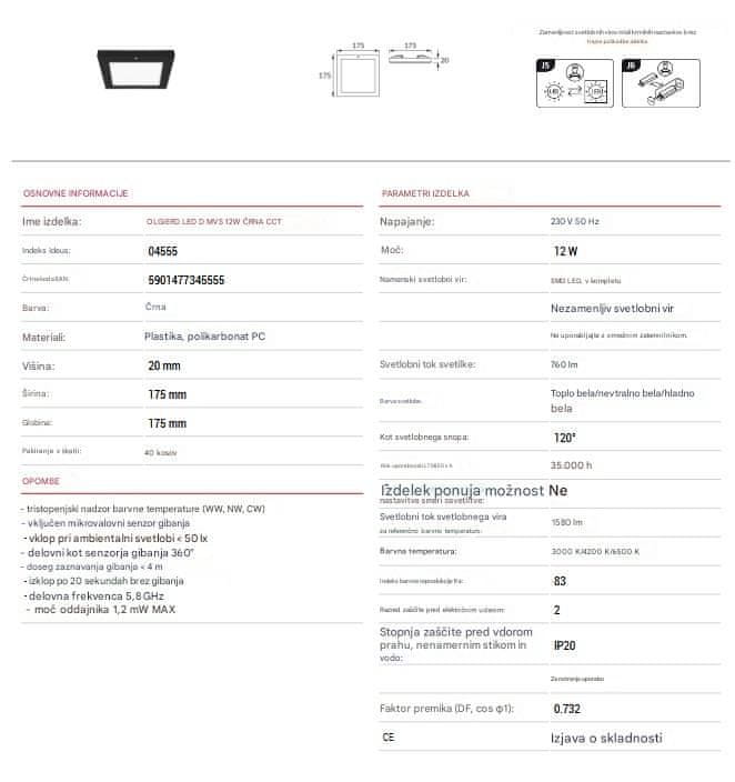 Ideus LED panel 12W vgradno-nadgradni s senzorjem 3CCT 1580lm IP20 OLGIERD črna
