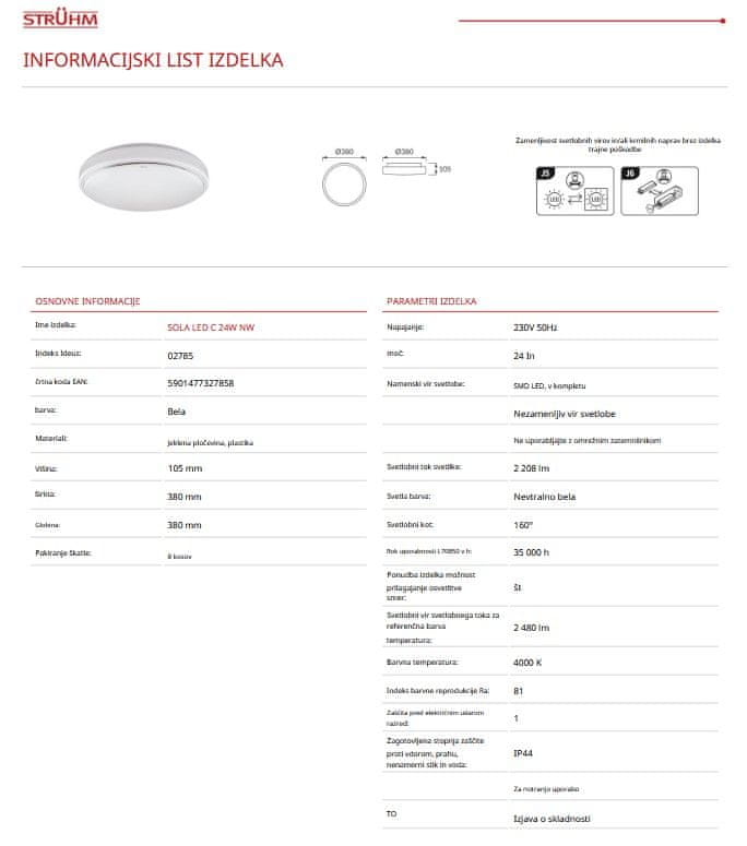 Svetilka sveti z močjo 24W s svetilnostjo 2480 lm.