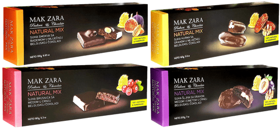 Paket štirih različnih okusov MAK ZARA, suho sadje z belgijsko čokolado, oreščki in medom vsebuje: