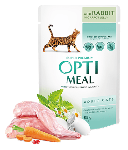 OPTIMEAL popolna hrana za odrasle mačke z zajcem v korenčkovem želeju. Naravna, uravnotežena, lahko prebavljiva in okusna.