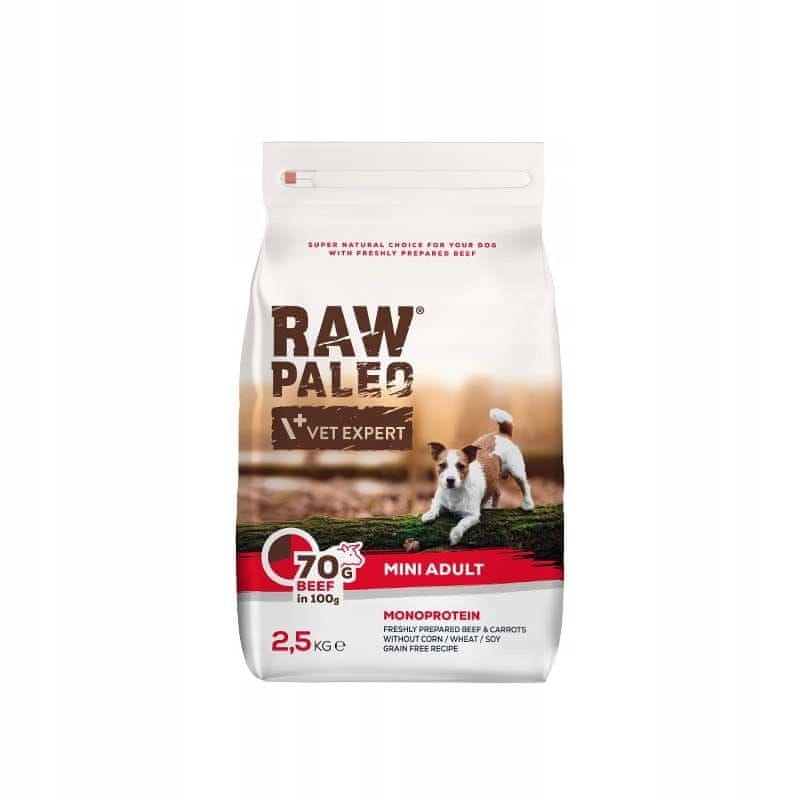 RAW Paleo GOVEDINA za odrasle pse majhnih pasem ⭐ RAW PALEO MINI ADULT z govedino je popolna in uravnotežena hrana za odrasle pse majhnih pasem (težke do 8 kg), od 1. do 7. leta starosti. ⭐ Receptura hrane ne vsebuje žitaric in je monoproteinska, kar pomeni, da je edini vir živalskih beljakovin govedina. ⭐ Dodatek lososovega olja in olja boraga pomaga ohranjati zdravo kožo in dlako. ⭐ Dodatek fruktooligosaharidov in mananoligosaharidov podpira zdravje prebave in stabilizacijo črevesne mikroflore. ❤️ Zakaj RAW PALEO MINI ADULT? ✅ visoka vsebnost govedine (kar 70 g v 100 g hrane) ✅ sveže pripravljeno meso je prva sestavina ✅ monoproteini – en sam vir živalskih beljakovin zmanjšuje tveganje za alergije ✅ brez žitaric – idealna hrana za pse z občutljivim prebavnim sistemom ✅ skrbno izbrane funkcionalne sestavine ✅ neverjetna okusnost, potrjena z raziskavami ✅ brez umetnih barvil, ojačevalcev okusa, konzervansov ✅ kakovost Human Grade – sestavine, odobrene za prehrano ljudi ✴️ Sestavine (g/100 g): Govedina 70 g/100 g (sveže pripravljena govedina (33 g/100 g); sušena govedina (27 g/100 g); goveja maščoba (10 g/100 g)); sladki krompir; krompir; sveže pripravljeno korenje (5 g/100 g); minerali; kvas; zelenjavna juha; lososovo olje (0,5 g/100 g); fruktooligosaharidi (0,05 g/100 g); Mananoligosaharidi (0,05 g/100 g); olje boražine (0,015 g/100 g). ✴️ Prehranski dodatki na kg: Vitamini: Vitamin A 14423 IU; Vitamin D3 (holekalciferol) 1923 IU; Vitamin E (alfa-tokoferil acetat): 96 IU; Minerali: Cink (cinkov sulfat monohidrat): 69 mg; Železo (železov (II) sulfat monohidrat): 48 mg; Mangan (manganov sulfat monohidrat): 34 mg; Baker (bakrov II sulfat pentahidrat): 12 mg, Jod (brezvodni kalcijev jodat in kalijev jodid): 1,7 mg, Selen (natrijev selenit): 0,19 mg. ✴️ Analitske sestavine: Surove beljakovine: 29,5 %; surove maščobe: 15,5 %; surove vlaknine: 2 %; Surovi pepel: 7 %; Omega 6 maščobne kisline: 1,1 %; Omega 3 maščobne kisline: 0,3 %, kalcij 1,2 %; fosfor 0,8 %; ✴️ Energijska vrednost: 390,5 kcal/100 g. *enakovredno 26 % sveže pripravljene govedine in 4 % sveže pripravljenega korenja, preden se odstrani voda ❤️ Zagotovite svojemu ljubljenčku dobro hrano ❤️ Z uravnoteženo prehrano bo vaš pes srečen in zadovoljen ❤️ Pravilno izbrana prehrana bo vašemu psu zagotovila pravilen odmerek energije
