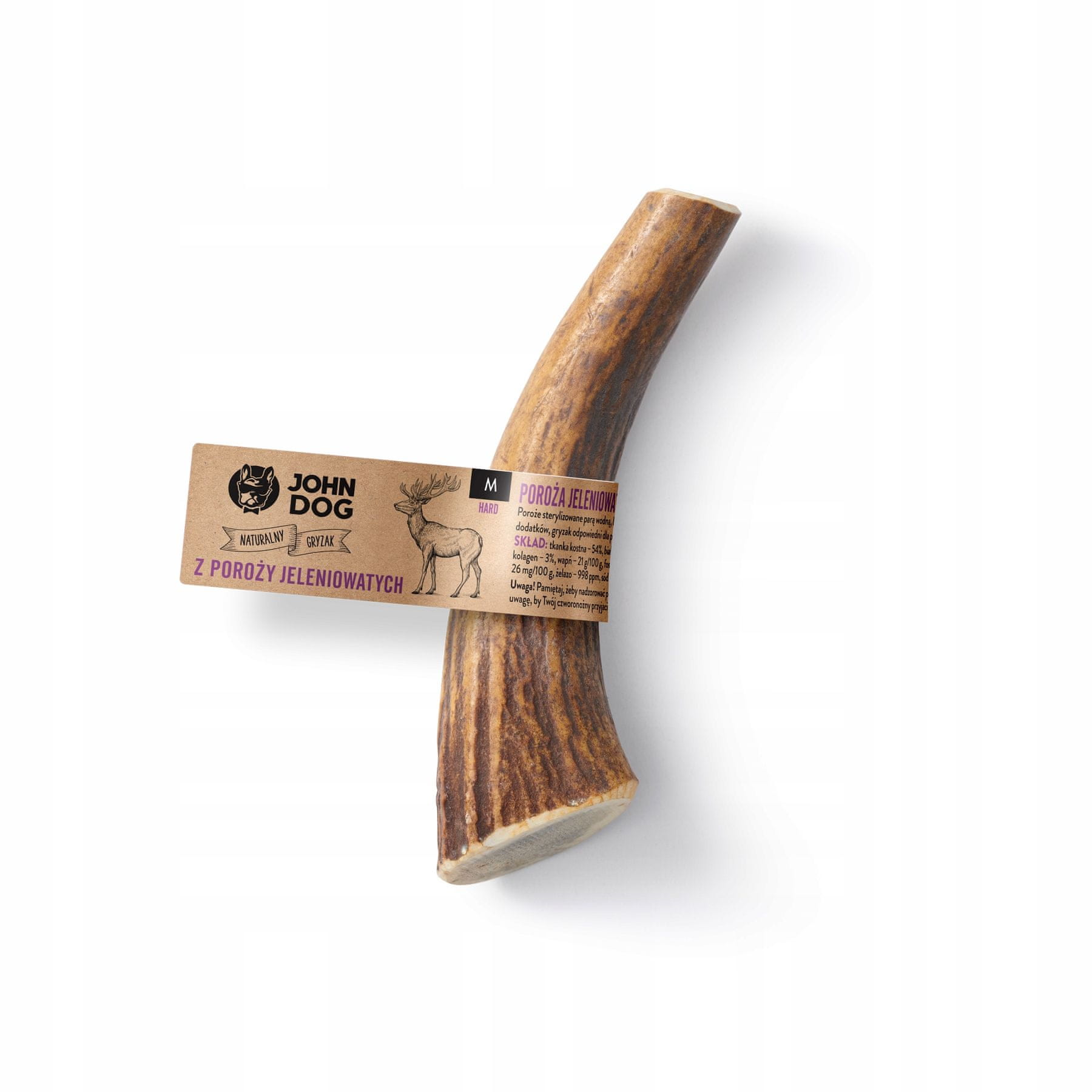 Naravna žvečljiva tarta iz jelenovih rogov HARD M, približno 12 cm. Izjemno trpežna. Popolna za ljubitelje žvečenja. Prednosti: Naravna, brez umetnih dodatkov, primerna za pse vseh pasem, na voljo v štirih velikostih, trpežna, brez vonja. Trpežna in dolgo obstojna žvečljiva tarta iz jelenovih rogov, ki bo vašemu psu zagotovila ure igre. Žvečljiva tarta je ročno izdelana iz naravno odvrženih rogov jelenov, damjakov in losov. Rogovi pomagajo čistiti zobe in pozitivno vplivajo na presnovo, krvni obtok, kostno strukturo, mišice in sklepe ter imunski sistem. Ne vsebuje umetnih dodatkov. Ne pušča ostankov in je brez vonja. Izberite pravo velikost za svojega psa in njegove žvečilne navade. Ta žvečljiva tarta ni primerna za mladičke, mlajše od 8 mesecev, ali starejše pse (nevarnost poškodb zob). Izdelek iz blata, nabranega v poljskih gozdovih. Sestava: kostno tkivo 54 %, beljakovine 32 %, maščobe 0,1 %, kolagen 3 %, kalcij 21 g/100 g, fosfor 10 g/100 g, magnezij 26 mg/100 g, železo 998 ppm, natrij 0,4 %, kalij 0,02 %. Rogovje je naravni proizvod; posamezna rogovja se lahko razlikujejo po obliki, barvi, debelini in dolžini. Pozor! Ne pozabite nadzorovati svojega psa. Pazite, da vaš štirinožni prijatelj ne pogoltne delčka rogovja. Velikost: M Standardni šnavcer, Jack Russell terier, jazbečar, dolžina približno 12 cm