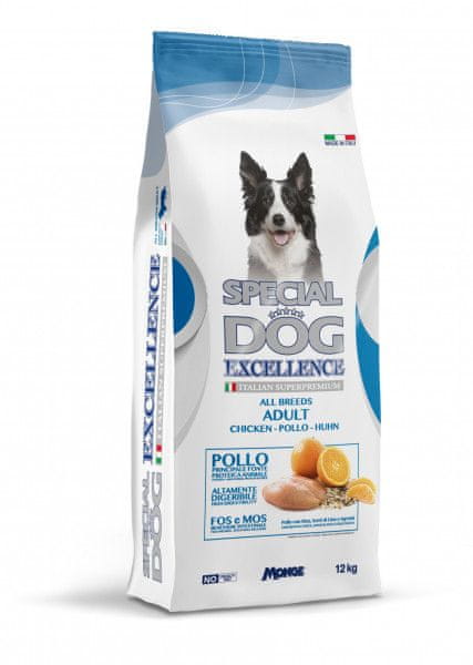 • Special Dog Excellence Adult All Breeds hrana s piščancem in rižem je namenjena odraslim psom vseh pasem. Obogatena je z lanenim semenom kot virom Omega-3 esencialnih maščobnih kislin za zdravo kožo in sijočo dlako. Vsebuje tudi citruse, bogate z vitaminom C za podporo imunskemu sistemu.