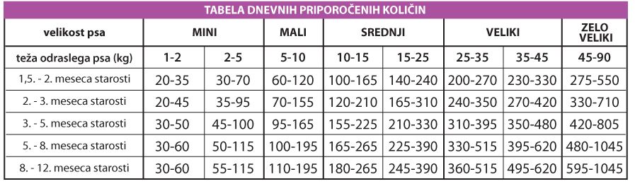 Navodila za hranjenje: Poglejte tabelo. Hrano lahko psu postrežete suho ali namočeno. Dnevna količina se lahko spreminja glede na starost, aktivnost in postavo psa, pa tudi glede na letni čas. Čisto, svežo pitno vodo mora imeti pes vedno na razpolago. Izdelek shranjujte v suhem in hladnem prostoru.