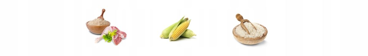 posušene perutninske beljakovine, polnozrnata koruza, riž, perutninska maščoba, pesina pulpa, hidrolizirane perutninske beljakovine, minerali (natrijev tripolifosfat 0,35 %), hidrolizirane živalske beljakovine, kvas, posušena korenina cikorije (naravni vir inulina).