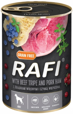 Mokra hrana Rafi je zaradi uporabe mesa in surovin živalskega izvora, kot sta govedina in svinjina, uravnotežen vir lahko prebavljivih in popolnih beljakovin ter maščob.