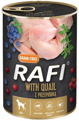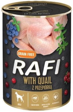 Mokra hrana Rafi ima zaradi uporabe prepeličjega mesa in sestavin živalskega izvora veliko beljakovin z bogato sestavo aminokislin (fenilalanin in cistin).