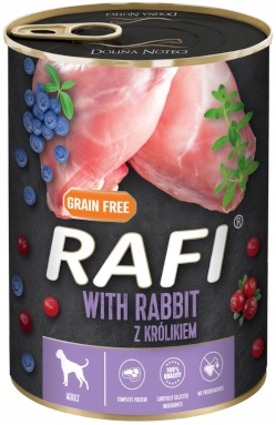 Mokra hrana Rafi je zaradi uporabe kunčjega mesa in sestavin živalskega izvora vir visokokakovostnih beljakovin ter železa, selena in cinka, ki pomagajo podpirati obrambne sposobnosti telesa.