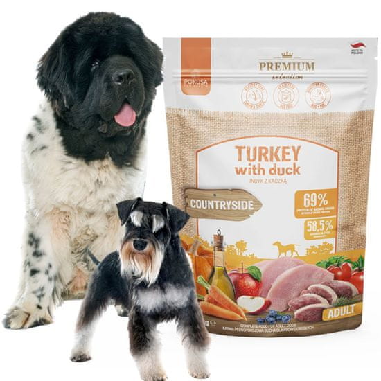 TEMPTATION PREMIUM suha hrana za pse PURAN z RACO ✅ hipoalergena formula brez žit ✅ super premium kakovostna hrana za odrasle pse srednjih in velikih pasem ✅ visoka vsebnost mesa brez dodanih stročnic Sestavine: puran 43 % (od tega 23 % posušenega purana, EN 20 % svežega purana), posušen krompir, goveja maščoba 7 %, posušena raca 4 %, hidrolizirane svinjske beljakovine 4 %, posušena buča 1 %, posušeno korenje 1 %, posušeno jabolko 1 %, posušen pivski kvas, posušena pesina pulpa (iz sladkorne pese), lososovo olje 0,5 %, posušena cikorija 0,5 %, MOS (0,5 % – mananoligosaharidi), minerali, posušen brokoli, posušeni paradižniki 0,15 %, posušena špinača 0,15 %, posušene borovnice 0,15 %, glukozamin, hondroitin sulfat, rastlinski izvlečki (Yucca Mojave, Rosmarinus sp. 0,05 %, Curcuma sp., Citrus sp., Eugenia sp.). Teža: 1 kg. Brezžitna, popolna super premium hrana na osnovi lahko prebavljivega purana z dodatkom okusne race in „superživil“, kot so poljska jabolka, posušena buča, korenje in lososovo olje. Ta hrana zagotavlja popolnoma uravnoteženo prehrano z optimalno količino lahko prebavljivih beljakovin visoke hranilne vrednosti. Zasnovana je za pse vseh pasem, še posebej pa je priporočljiva za srednje velike in velike pasme s povečanimi potrebami po hranilih. Posebej izbrana velikost briketov je odlična tudi za pse, ki imajo raje večje brikete. Priporočljivo za pse z normalno in povečano aktivnostjo. Dodatek vrhunskega lososovega olja je bogat z omega-3 maščobnimi kislinami, EPA in DHA, ki so bistvenega pomena za dlako in kožo vašega psa. Svež puran je odličen vir vitaminov, mineralov in visokokakovostnih, lahko prebavljivih beljakovin. Beljakovine prispevajo k rasti mišične mase in pomagajo ohranjati zdrave kosti. Dodatek race, bogate z nenasičenimi maščobnimi kislinami, zagotavlja odlično okusno izkušnjo. Kombinacija teh dveh vrst mesa naredi Premium Selection PURAN Z RACO popolno izbiro za najzahtevnejše pse srednje velikih in velikih pasem s povečanimi prehranskimi potrebami. Dodatek mananoligosaharidov (MOS) zagotavlja pravilno črevesno mikrofloro. Fruktooligosaharidi (FOS) izboljšujejo prebavo in zavirajo rast patogenih mikroorganizmov. Naravni rastlinski izvlečki zagotavljajo pravilno delovanje črevesja in krepijo imunski sistem. Visoka vsebnost svežega mesa v kombinaciji s suhim mesom zagotavlja visoko okusnost, hkrati pa ohranja vse hranilne vrednosti in visoko prebavljivost. Zaradi hidrolize beljakovin, ki jo uporabljamo v našem proizvodnem procesu, ki beljakovine razgradi na manjše komponente (tako da jih pasji imunski sistem ne prepozna kot alergene), je naša hrana odlična alternativa za pse z alergijami. Recept vsebuje kompleks hondroprotektivnih sestavin, ki so odgovorne za pravilno delovanje in razvoj mišično-skeletnega sistema, kar je še posebej pomembno za aktivne, hitro rastoče pse, pa tudi za velike in velikanske pasme.