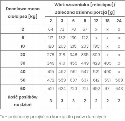 Dnevne potrebe, navedene v tabeli, so približne. Prehranske potrebe se lahko razlikujejo glede na pasmo, starost, temperament in stopnjo aktivnosti živali. Priporočljivo je, da dnevni odmerek hrane razdelite na dva ali tri obroke (glejte zgornjo tabelo).