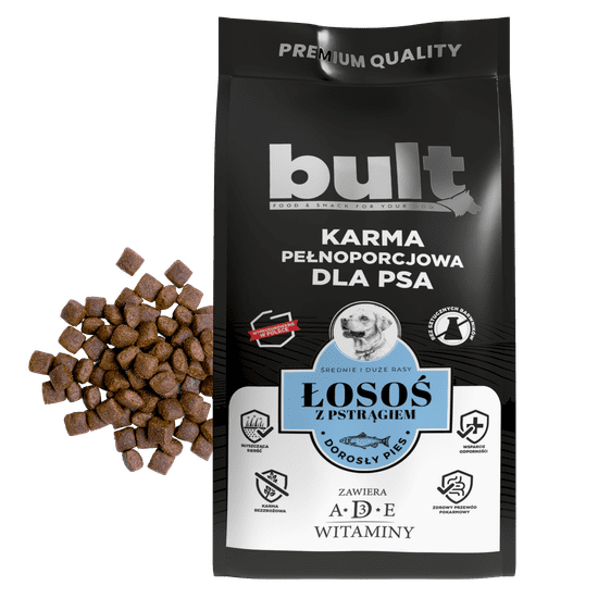 BULT suha hrana z lososom in postrvjo je popoln obrok brez žitaric za odrasle pse srednjih in velikih pasem. Bogat je s funkcionalnimi dodatki, ki koristijo telesu vašega psa. Omega-3 maščobne kisline, ki jih najdemo v ribah, podpirajo zdravo kožo, sijočo dlako in močne sklepe. Laneno seme, posušena cikorija in posušeni, dražji pivski oreščki pozitivno vplivajo na prebavni sistem. Vitamini in rastlinski izvlečki krepijo imunski sistem in zagotavljajo dnevno energijo.