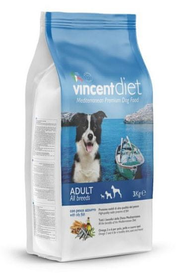 Vincent Diet hrana za odrasle pse, riba, 15 kg, je okusna in zdrava suha hrana, ki psom zagotovi vse kar potrebujejo in pomaga uravnavati prebavo.