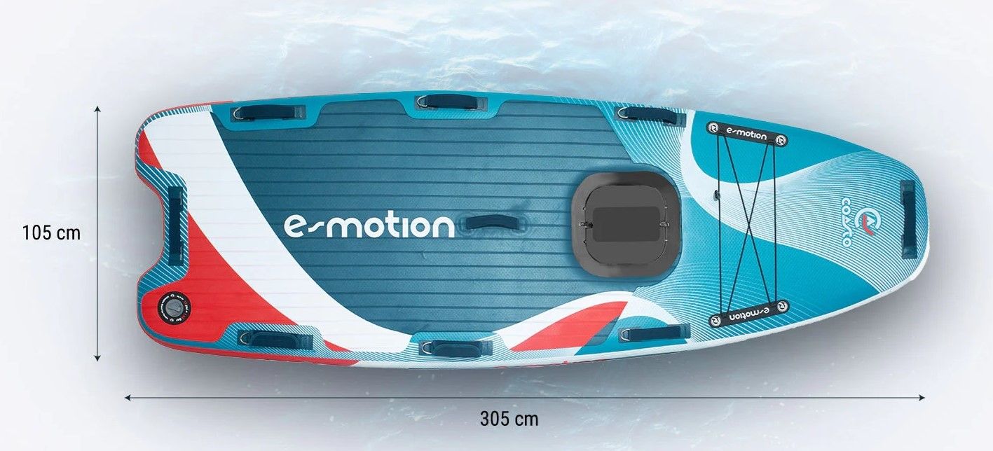 Coasto E-Motion električni SUP predstavlja inovativnost na trgu napihljivih desk za stoječe vesljanje. Združuje napihljivo SUP desko ter električni pogon. Obiščite in raziskujte kraje, ki jih z navadno desko prej niste mogli. Dimenzije SUP-a znašajo 305 × 105 × 15 cm, maksimalna nosilnost 180 kg. Celoten opis