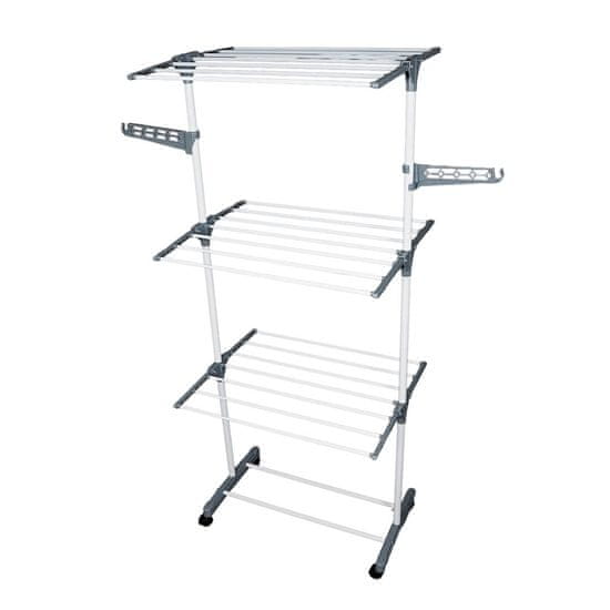 Zložljiv stolpni sušilnik s kovinsko konstrukcijo je zasnovan tako, da omogoča maksimalno izkoriščanje prostora v višino. Opremljen je s 4 policami, ki ponujajo dovolj površine za sušenje večje količine perila naenkrat, ne da bi zavzel veliko talne površine. Dimenzije 72 × 56 × 170 cm omogočajo, da stojalo postavite tudi v manjše prostore, kot so kopalnice, pralnice ali balkoni. Zahvaljujoč vgrajenim kolesom ga lahko enostavno premikate, tudi ko je obteženo s perilom.