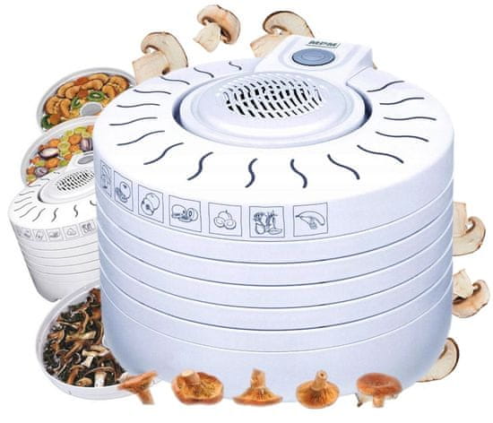Dehidrator hrane MPM MSG-01 za gobe in sadje je najboljši način za ohranitev dragocenih hranil, ki jih najdemo v zelenjavi, sadju in zeliščih. Zamenjajte že pripravljene, kupljene izdelke z zdravimi prigrizki. Naprava deluje tiho in učinkovito ter suši izdelke v pogojih, ki so blizu naravnim: sončnim in vetrovnim. Napravo lahko varno pustite delovati čez noč – popolnoma je varna. Značilnosti: Brez BPA; hitro in učinkovito suši: gobe, sadje, zelišča, rože in sadje. Parametri: Napajanje: 230 V, 50 Hz; Moč: 250 W; Premer sita: 28 cm; Število sit: 5; Nastavitev višine sita: Da. ABC – Sušenje gob: Gob pred sušenjem ne umivajte. Očistite jih s krtačo ali rahlo vlažno krpo. Sušenje gob običajno traja približno 6 ur. Dobro posušena goba se bo zlomila le, če jo močno pritisnete. Končane konzerve shranjujte v tesno zaprtih kozarcih ali kovinskih posodah. Posušene gobe lahko tudi zmeljete v prah in jih uporabite kot aromatično začimbo za meso, omake in juhe. Najhitrejši postopek sušenja. Dehidrator hrane MSG-01 je opremljen s petimi siti, ki jih je mogoče nastaviti po višini. Gobe ali druga živila narežite na kose, ki so dovolj veliki, da se udobno prilegajo med sita. Pretok zraka se aktivira z gumbom na zgornjem pokrovu. Zdravi prigrizki. V dehidratorju lahko sušite več kot le gobe. Uporabite sveže sadje in zelenjavo, zelišča in rože ter uživajte v njihovih naravnih lastnostih. Posušena zelišča lahko uporabite kot osnovo za zdrav, aromatičen čaj ali kot nadomestek za kupljene zelenjavne kocke. Suho sadje in zelenjava sta odlična alternativa zdravemu in sladkemu prigrizku za otroke. Domač čips ne vsebuje konzervansov in nezdravih sladil. Dvigne energijo in predvsem zagotavlja dragocene elemente v sledovih in vitamine.